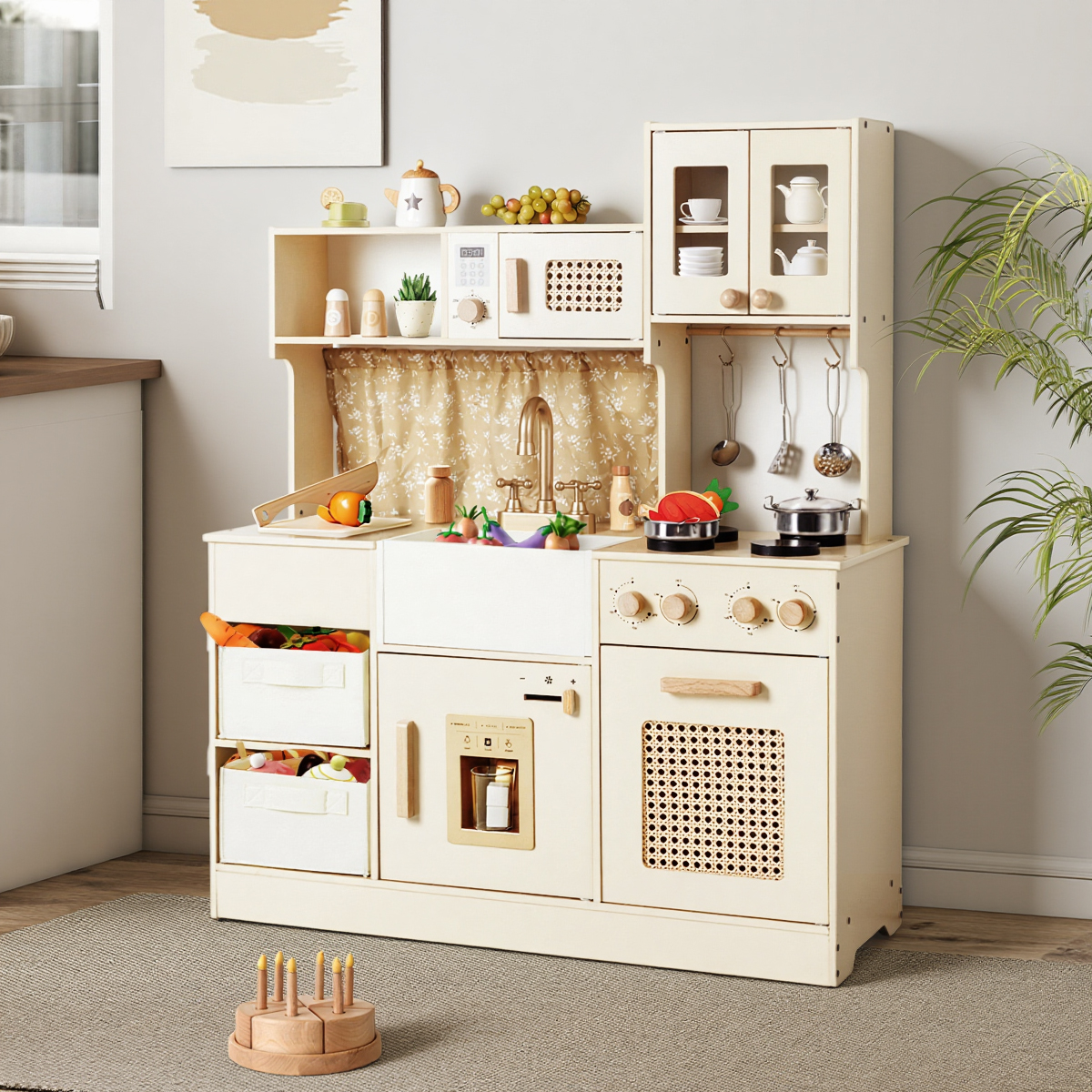 Integrates play sink, stovetop and tiered storage in one compact frame. Rattan details and scaled components balance imaginative play with practical skill-building for small hands.